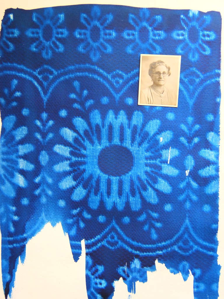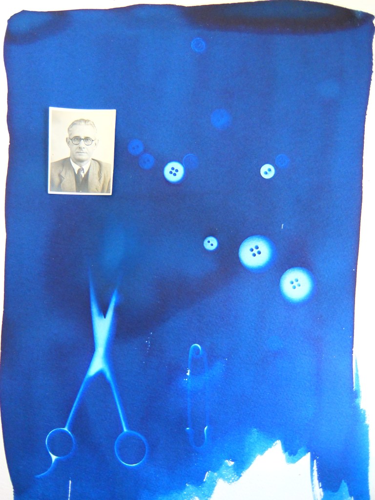 The resulting series mixes cyanotype print with family photographs, playing with the alchemy of the light, object and memory with deep blues and painterly gestures.